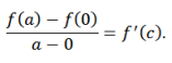 Karena f kontinu dan mempunyai turunan pada (0, a), menurut Teorema Nilai Rata-Rata untuk turunan, terdapat c di antara 0 dan a sedemikian sehingga