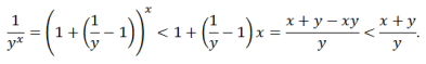 Penasaran dengan ketaksamaan pangkat + eksponen pada postingan sebelumnya? Ketaksamaan ini loh: jika x, y > 0, maka xy + yx > 1. Arini S. Putri sudah memberikan buktinya, tetapi detilnya belum sempurna. Saya perbaiki buktinya sebagai berikut. Jika salah satu di antara x atau y bernilai lebih besar daripada atau sama dengan 1, maka ketaksamaan jelas berlaku. Sekarang asumsikan x dan y lebih kecil daripada 1. Alih-alih menghitung xy dan yx, kita hitung 1/xy dan 1/yx. Menggunakan ketaksamaan Bernoulli II, kita mempunyai