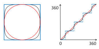 Nah, bila kita gambarkan grafik sudut deviasi pada persegi, segilingkar, dan lingkaran dalam satu sistem koordinat yang sama, maka kita peroleh seperti di bawah ini, sebelah kanan: