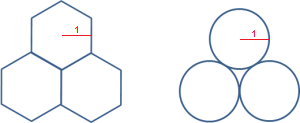 Dengan menggunakan bentuk segi enam beraturan, diperlukan keliling total 10√3 (bukan 12√3) satuan panjang dan dihasilkan luas yang lebih besar dibandingkan dengan menggunakan bentuk lingkaran yang memiliki keliling total 6π satuan panjang. Sila cek bahwa 10√3 < 6π.