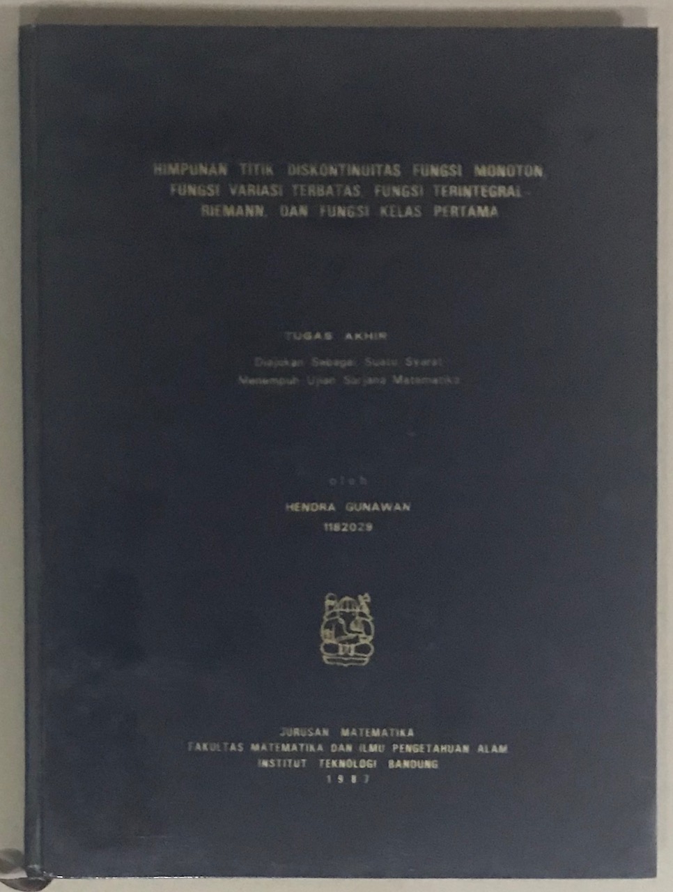 Saya akan memulainya dengan topik Tugas Akhir saya yang berjudul “Himpunan Titik Diskontinuitas Fungsi Monoton, Fungsi Variasi Terbatas, Fungsi Terintegralkan Riemann, dan Fungsi Kelas Pertama.”