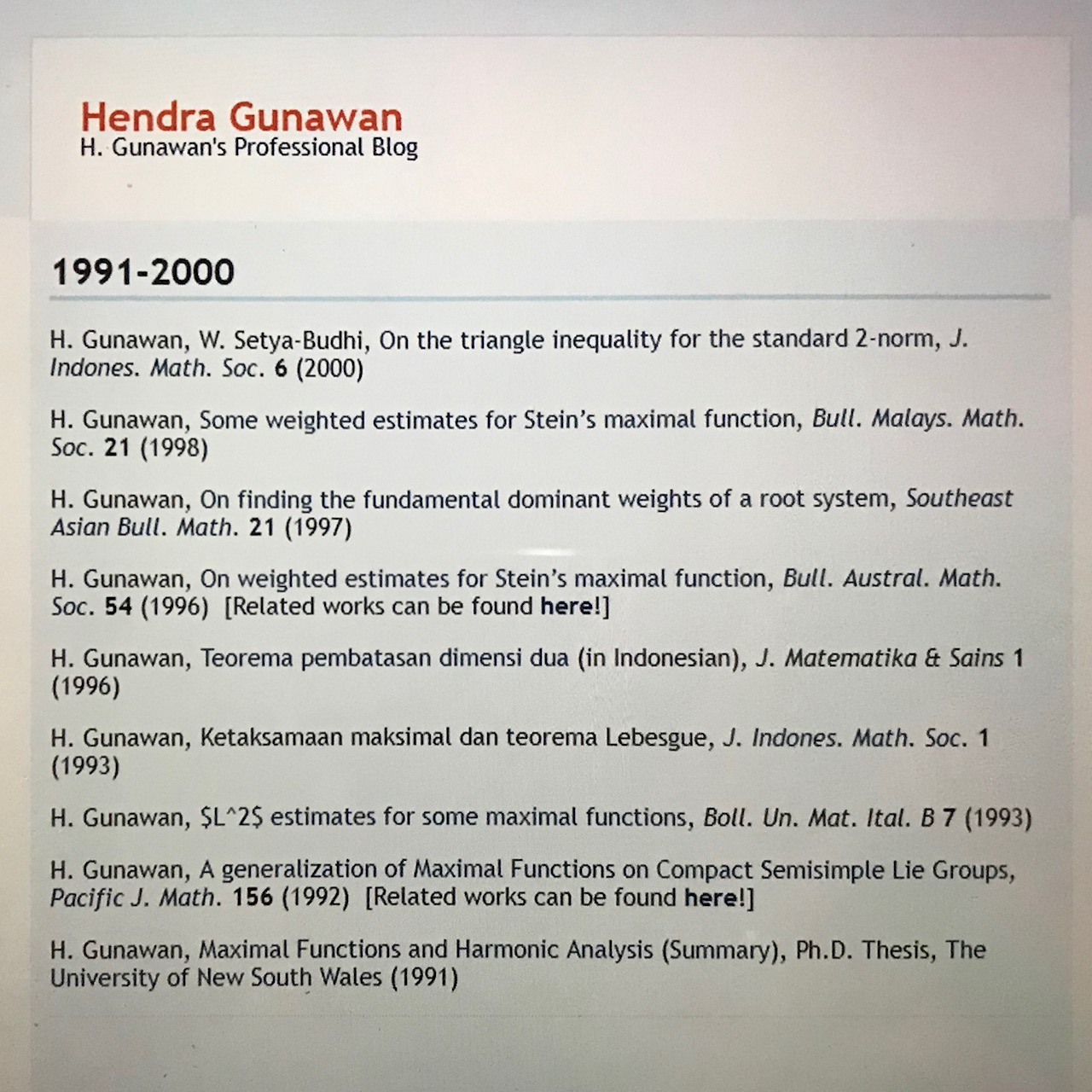 – H. Gunawan, Teorema pembatasan dimensi dua (in Indonesian), J. Matematika & Sains 1 (1996).