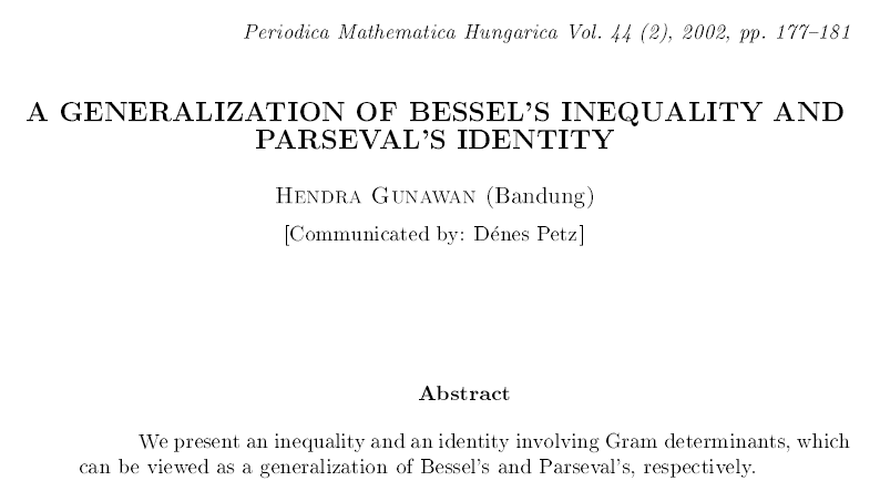 Bila Anda tertarik membacanya, sila paper berjudul “A generalization of Bessel’s inequality and Parseval’s identity” yang terbit di Periodica Math. Hungarica 44-2 (2002), 177-181.