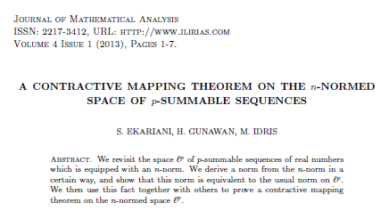 Bila Anda tertarik untuk mempelajari buktinya, sila unduh paper “A contractive mapping theorem on the n-normed space of p-summable sequences“, yang dipublikasikan di J. Math. Analysis 4-1 (2013), 1-7.
