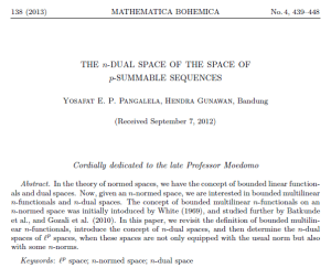 Nah, Harry, Oscar, dan saya mempelajari fungsional linear dan fungsional-n multilinear terbatas pada ruang barisan-p, dan sebagai outputnya kami mempublikasikan dua paper, yaitu “Bounded linear functionals on the n-normed space of p-summable sequences” yang terbit di Acta Universitatis Matthiae Belii, series Mathematics (2013), 66-75, dan “The n-dual space of the space of p-summable sequences” yang terbit di Mathematica Bohemica 138 (2013), 439-448.