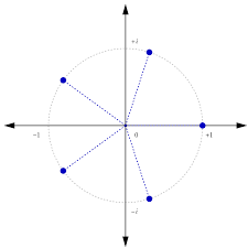Sebagai ilustrasi, di bawah ini adalah plot lima buah akar ke-5 (dari) 1 pada bidang kompleks.